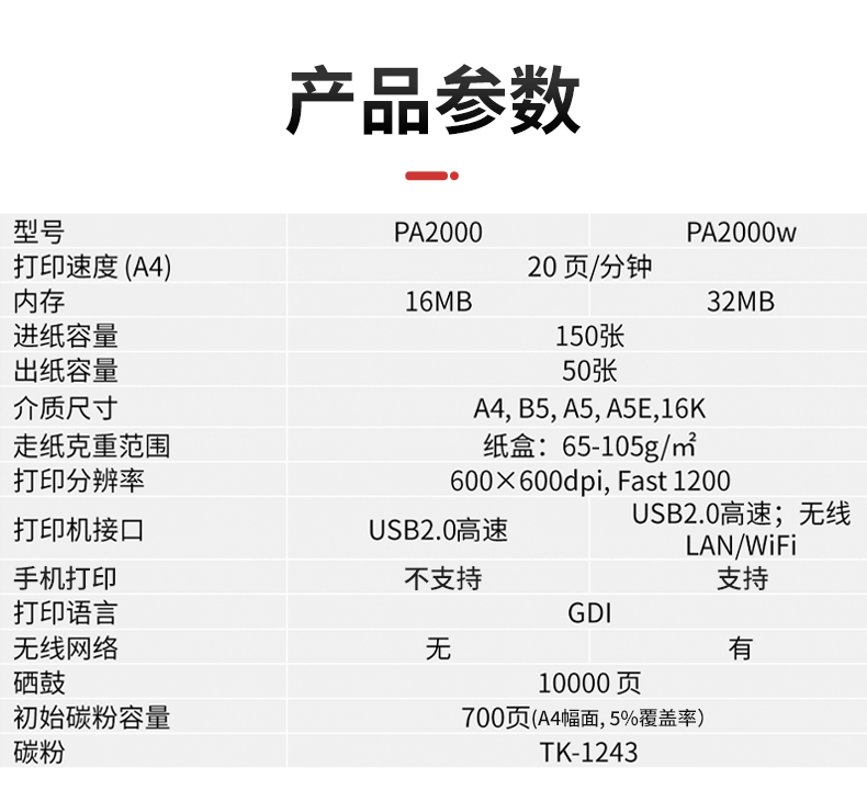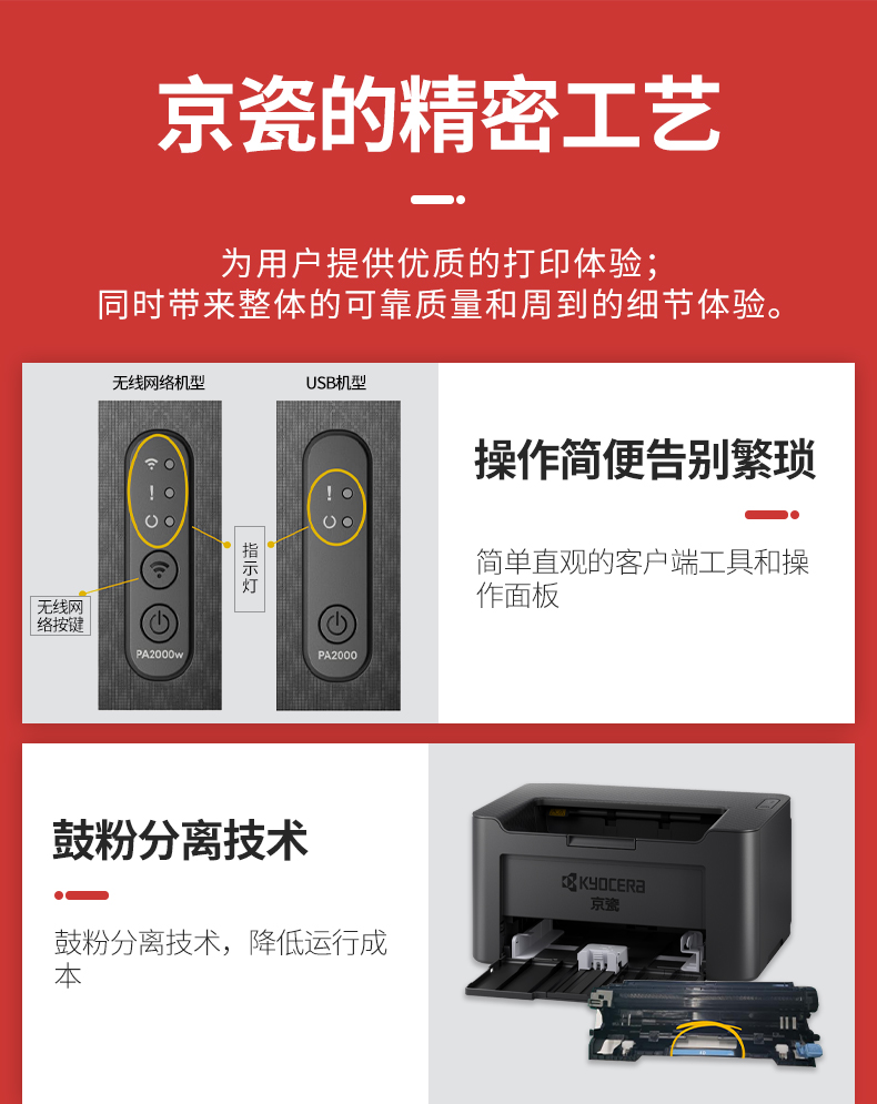 • 產(chǎn)品名稱:京瓷(KYOCERA)PA2000/PA2000W A4多功能黑白激光打印機(jī) 辦公家庭